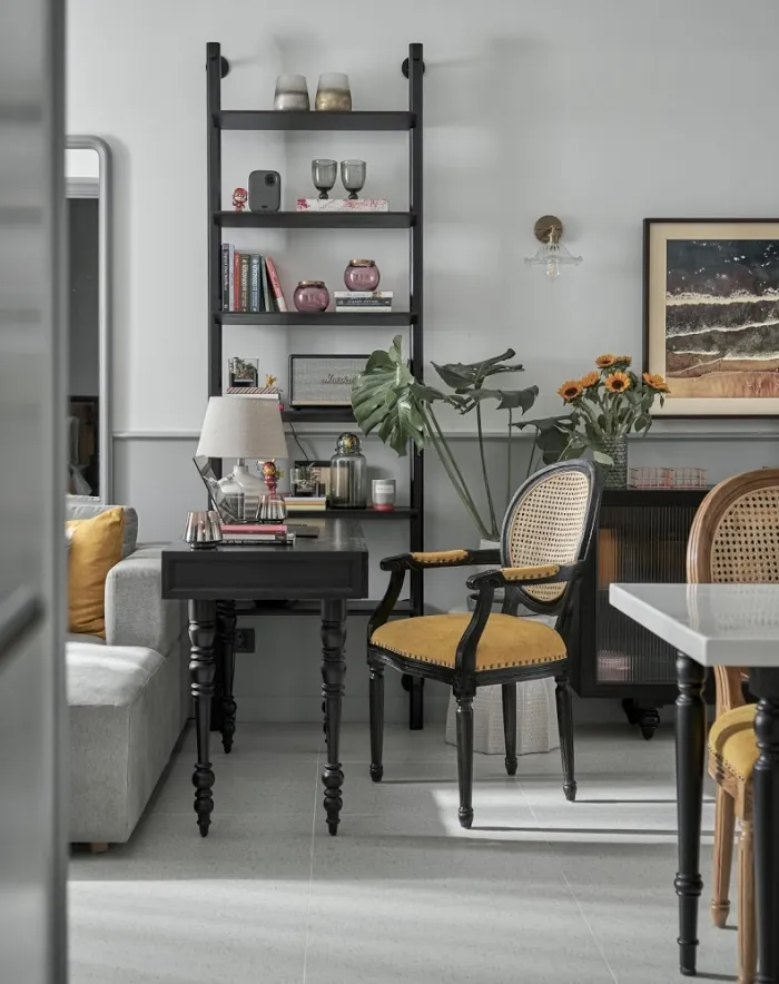 全屋以灰色調(diào)為主體現(xiàn)出自然簡約的氣質(zhì),在家具的選擇上,通過如墨黑編織邊柜、羅馬腳書桌、藤編感單椅、雕花玻璃吊燈等映襯清新氣息,并添加一點(diǎn)鮮活暖黃色提升視感溫度,讓以黑白灰的純粹基底充滿優(yōu)雅身影。